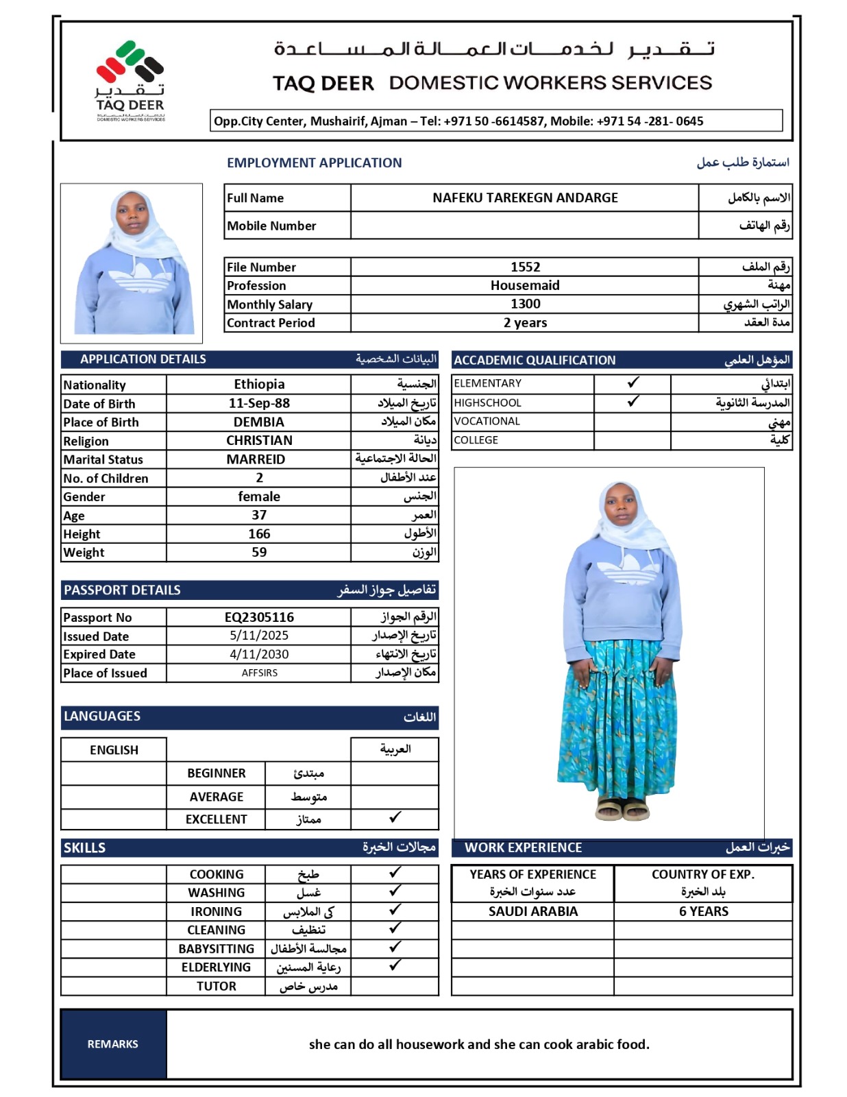 Ethiopian Christian woman, 37 years old, working in Saudi Arabia for 6 years cleaning, washing, ironing and cooking