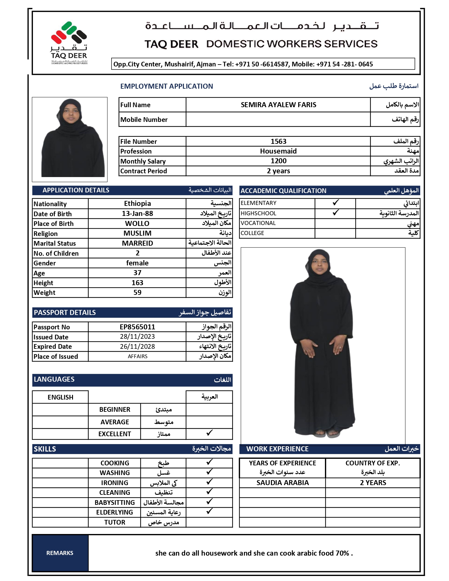 Ethiopian Muslim woman, 37 years old, working in Saudi Arabia for 2 years, cleaning, washing, ironing, and cooking.