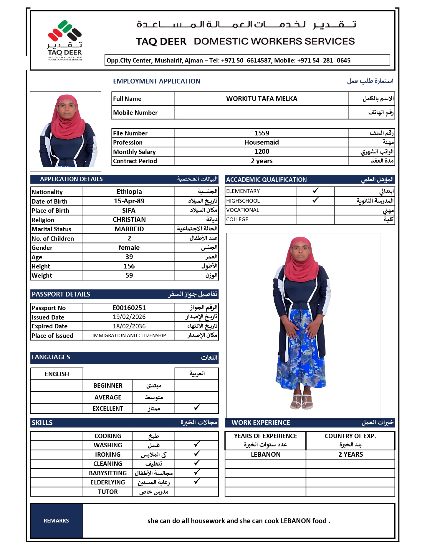 Ethiopian Christian woman, 35 years old, worked in Saudi Arabia for 2 years and the UAE for 2 years, cleaning, washing, ironing, and help in kitchen.